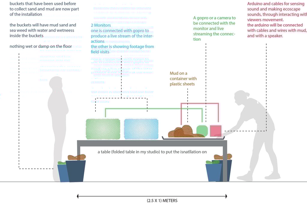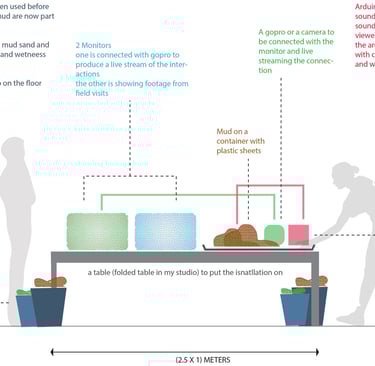 At this point, the table has been accumulated and refined into an installation with mud. Living mud has the choice to exist independently or to enter into dialogue with anyone interested in engaging with it. The elements of the table represent feelings, emotions, memories, and other senses. Mud Do Feel has become an interactive sound sculpture that engages with the passer’s thoughts. What is mud when placed on a table and fused with machines and technology?